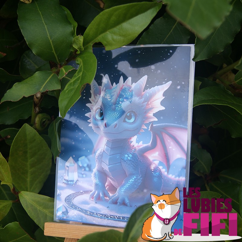 Le format 7,5 × 10 cm a été choisi pour sa praticité. Il se loge facilement entre deux pages sans marquer ni abîmer le papier. L’illustration est imprimée en haute définition, puis plastifiée dans notre atelier à Jargeau. Cette finition apporte une protection durable contre les frottements et les micro-taches, tout en conservant la brillance subtile des écailles et l’éclat des zones givrées. Le rendu, net et lumineux, met en valeur les bleus pâles, les gris argentés et les rehauts irisés typiques de l’esthétique glacée.