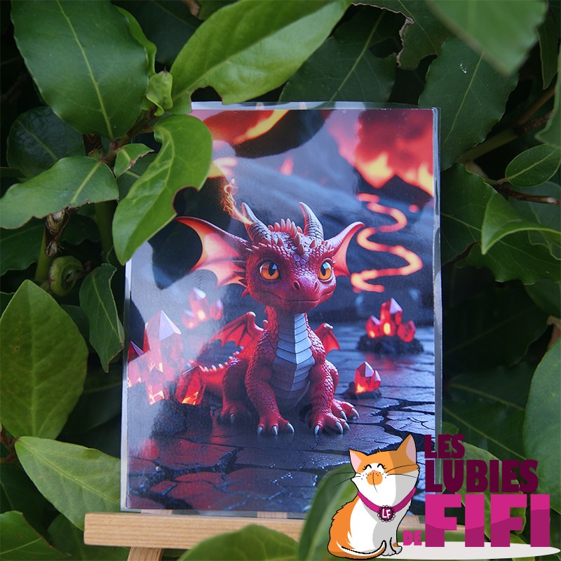 Atmosphère feu et intensité : dragon rouge, reflets ardents et rendu lumineux pour une énergie d’audace et d’action.
