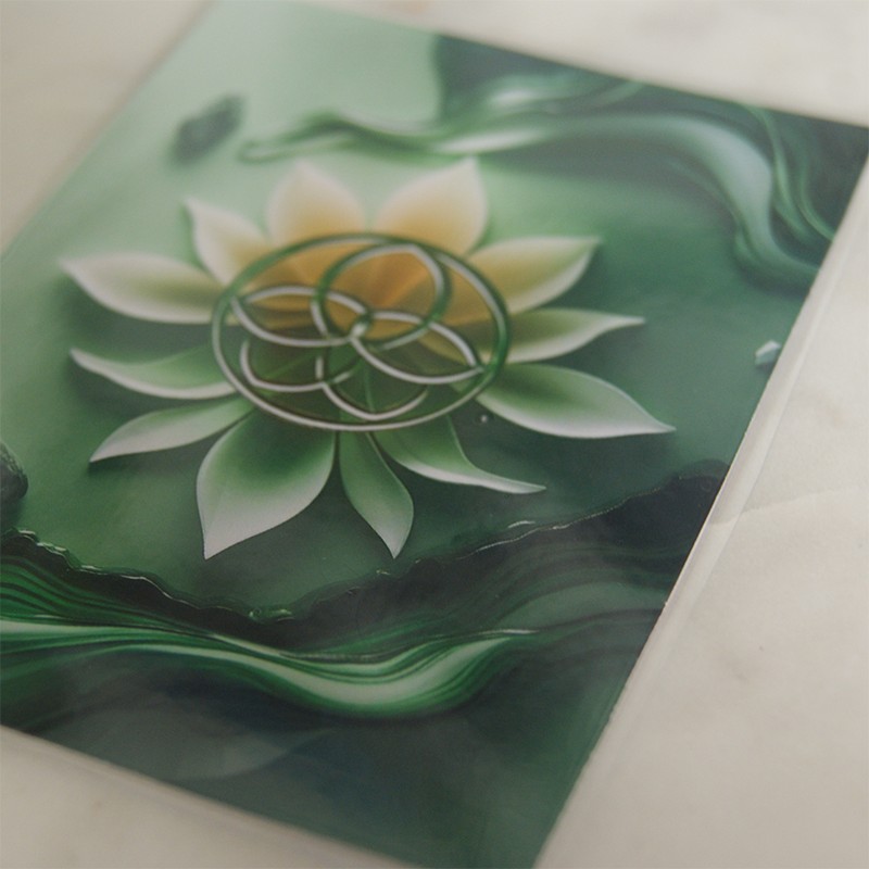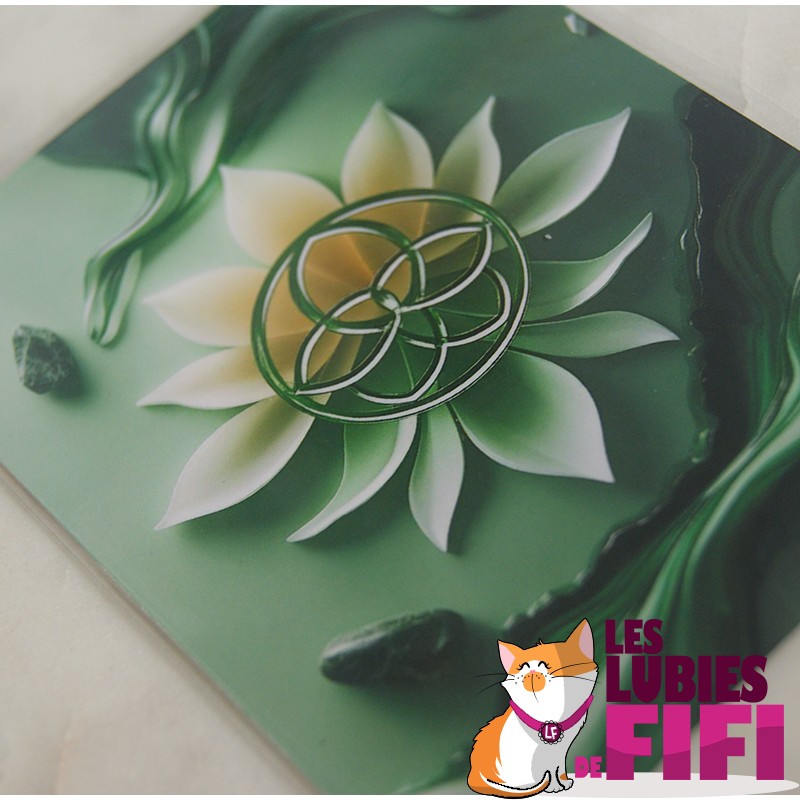 Cette carte de rechargement pour pierres naturelles est un support compact et esthétique pour vos rituels avec les minéraux. L’illustration originale Les Lubies de Fifi représente un lotus vert traversé d’un motif de géométrie sacrée au rendu lumineux. La finition plastifiée protège l’impression et permet une utilisation régulière sans altérer les couleurs.