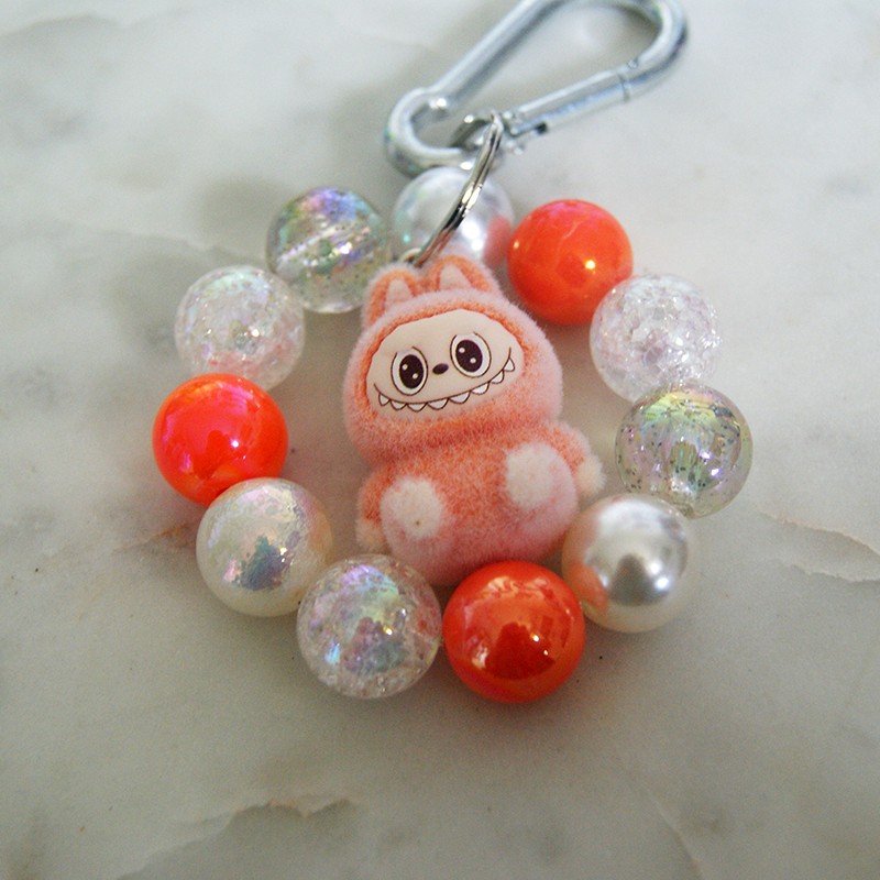 Ajoutez une note fun à vos clés avec ce porte-clés Labubu orange. Le pendentif Labubu effet velours est entouré d’un anneau de perles mêlant blanc nacré, orange glossy et perles irisées scintillantes pour un rendu lumineux.