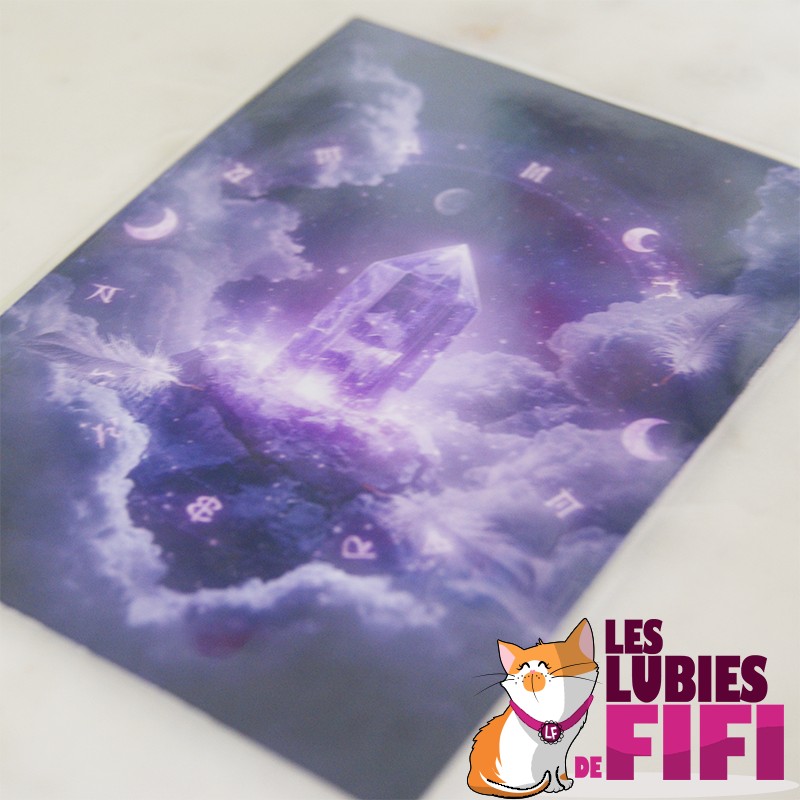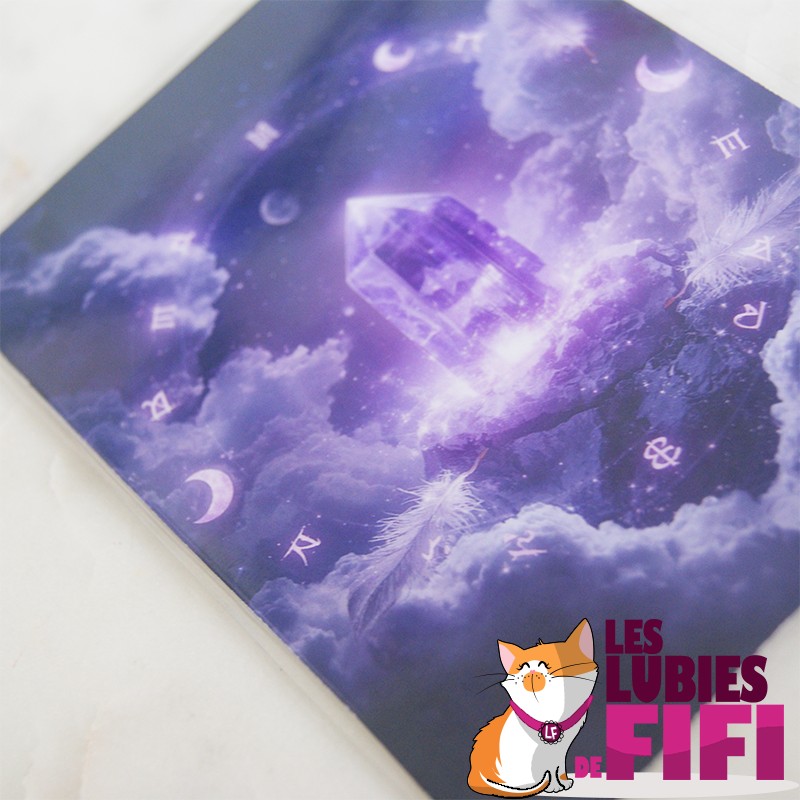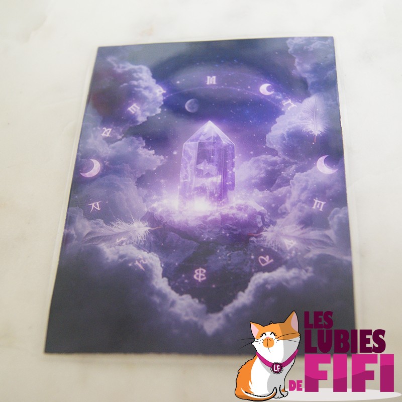 Pensée pour accompagner vos rituels du soir, la carte “Sommeil à l’Améthyste” présente un cristal d’améthyste au cœur d’un ciel nocturne ponctué de lunes et de runes protectrices. L’illustration HD est plastifiée pour durer : surface protégée, couleurs profondes et bords nets.