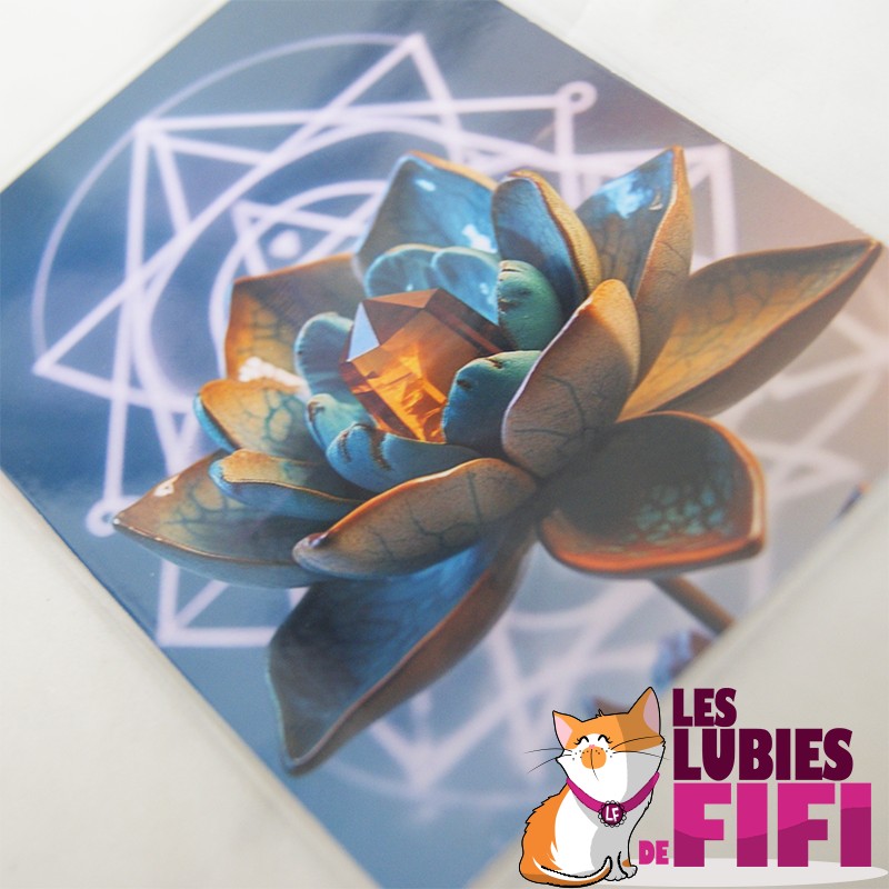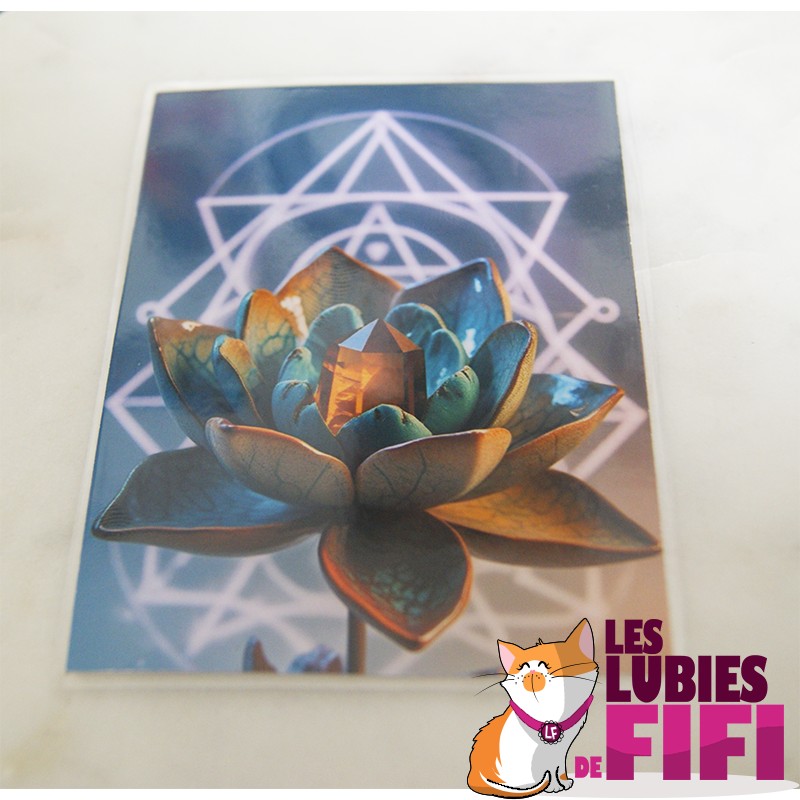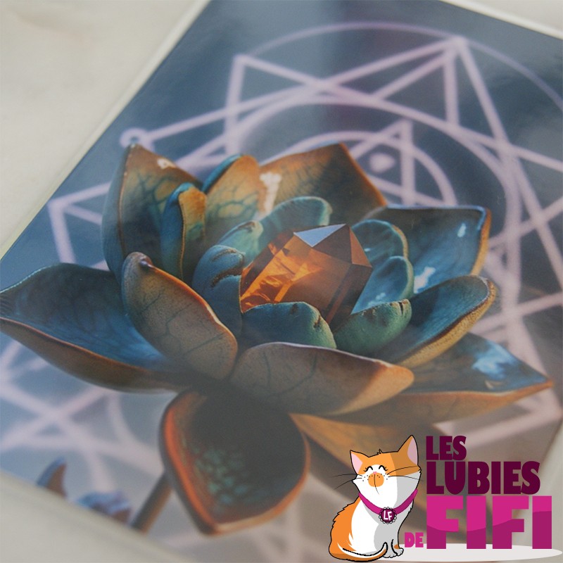 Pensée pour l’ancrage et la sécurité intérieure, cette carte de protection met en scène un lotus effet raku aux pétales texturés, abritant un cristal ambré. En arrière-plan, une géométrie sacrée renforce l’intention de protection.